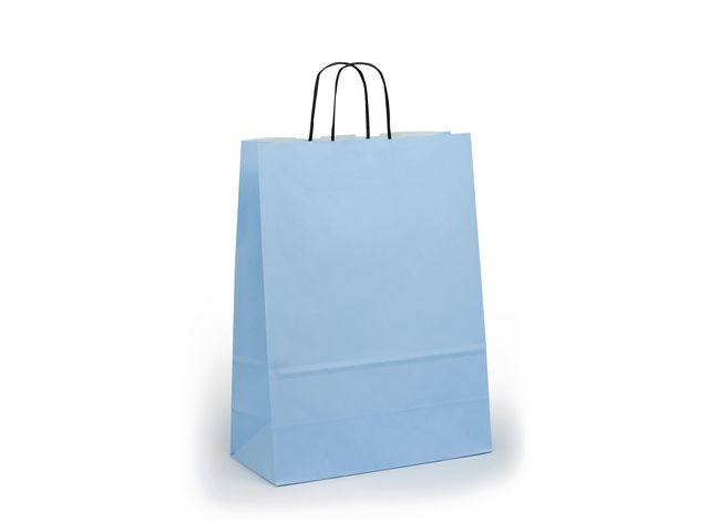 Högkvalitativ papperskasse med handtag av tvinnat papper och förstärkt botten. - Mått: 19x8x21cm - Färg: Ljusblå