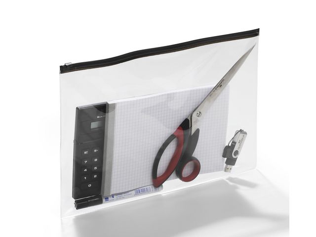 Produktbeskrivning:Du kan använda den här blixtlåsförsedda fickan från DURALBE för förvaring av viktiga dokument eller små fickvänliga prylar när du reser. Den blixtlåsförsedda fickan från DURABLE kan användas för att förvara kosmetika, brevpapper eller viktiga kvitton. Du får enkelt plats med minst fem artiklar. Detta säkerställer att du snabbt har tillgång till allt du behöver. Dessutom kan du se innehållet i den blixtlåsförsedda påsen utan att behöva ta ut artiklarna eftersom påsen är genomskinlig. - Blixtlåsförsedd - Kapacitet: Upp till 5 artiklar - Material: Transparent - Mått: A4 - Färg: Svart - Mått: 210 x 297 mm