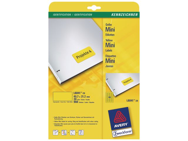 Produktbeskrivning:Avtagbara färgade etiketter Färgade avtagbara etiketter lättare att upptäcka. När det är många olika projekt igång kan vara svårt att hålla reda på vilka uppgifter som är mest angelägna. Om du färgkodar uppgifterna med Avery L6038-20 avtagbara röda etiketter med 48 etiketter/ark och 960 etiketter/förpackning kan hela teamet enkelt få överblick över uppgifterna för handen. Du kan t.ex. använda de röda etiketterna för att märka brådskande uppgifter som måste utföras denna vecka och de gula för uppgifter som kan vänta lite. Eller så kan du färgkoda uppgifterna efter vilka projekt de hör till, det är helt upp till dig ? välj det system som passar dig och ditt team. Etiketterna är avtagbara och kan enkelt avlägsnas utan att lämna kvar limrester, vilket gör dem perfekta för tillfällig märkning. Kan skrivas ut på alla skrivare, och Averys JamFREE?-garanti säkerställer dessutom att du inte behöver bekymra dig för om etiketterna fastnar i skrivaren och orsakar stopp. - Mått: 45,7x21,2mm - Färg: Gul - Limtyp: Avtagbara - Bläckstråleskrivare - Färglaserskrivare - Svartvit laserskrivare - Kopieringsmaskin