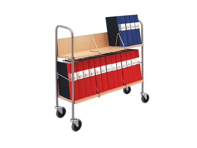 Produktbeskrivning:Den här pärmkärran är lämplig för kontoret, skolan eller biblioteket och den levereras med hjul för enkel förflyttning av arkivpärmar och tidskrifter. Den här pärmkärran levereras med två hyllor som rymmer upp till 26 arkivpärmar. Kärran är tillverkad av björklaminat och metall och är stabil och hållbar. Den levereras dessutom med fyra bokavdelare som smidigt kan justeras för att kategorisera böcker, filer och mappar som ska placeras på den. Björklaminatet på översidan och den gråa stativet ger kärran ett diskret utseende, vilket gör den lämplig för kontor och bibliotek. - Med justerbara bokavdelare - Rymmer upp till 26 arkivpärmar - Levereras med fyra hjul - Grått stativ medföljer - Material: Björklaminat och metall - Antal hyllor: 2 - Maximal belastning per hylla: 90 kg - Mått: 910 x 860 x 340 mm