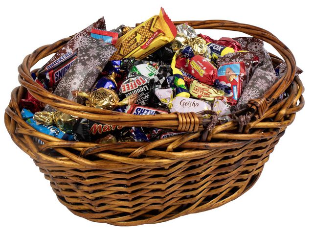 Produktbeskrivning:Godiskorg fylld med mix av kola & choklad av kända varumärken. Upptäck en härlig mix av välkända favoriter förpackade i brun korg med handtag, guldig rosett och cellofan. Passar för receptionsdisken, julbordet, lunchrummet med mera, en perfekt present för alla godisälskare. Det finns en godsak för alla! Innehåll: Dumle, Dumle Lakrits, Geisha, Fazer Blå, Mars, Twix, Snickers, Bounty, Fox citron, Eclaires mixkolor 5 olika sorter, Riesens mörk, Werter´s original creamy, Kexchoklad, Plopp, Lonka vaniljfudge sea salt, Klassiska skumtomtar, Pralinkulor silverfolie (caramel), Pralinkulor guldfolie (hasselnöt), Pralinkulor rött folie (kakao). - 1,5kg