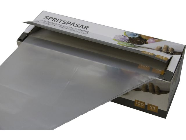Spritspåsar för dekorering. Engångsspritspåsar på rulle tillverkade av COEX-polyeten för bästa hållbarhet. Används vid uppläggning och dekorering av mat och bakverk. Påsen är 100% återvinningsbar. Vid förbränning bildas vatten och koldioxid, energin som uppstår kan t ex användas till uppvärmning. - Engångsspritspåsar - Material: COEX-polyeten - 53 cm - 100% återvinningsbar