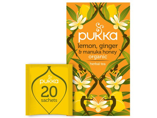 Produktbeskrivning:Ordet Pukka betyder äkta och genuin, vilket också är tanken bakom Pukka-teerna! Pukka Lemon, Ginger & Manuka Honey är en härlig blandning av citron, kryddig ingefära och manukahonung. De mogna citronerna och ingefäran torkas långsamt för att behålla så mycket smak som möjligt. Därefter blandas frukt och ingefära med den underbara manukahonungen som ger teet dess runda, mjuka smak. Naturligt koffeinfri. Ingefära (32%), lakritsrot, fläderblom, fänkålsfrö, citronverbena, gurkmeja, naturlig smak från essentiell citronolja (6%), citronmyrten, citron hel (4%), manukahonungssmak (2%). (*innehåller icke-ekologisk antioxidant: askorbinsyra). - Ingefära (32%), lakritsrot, fläderblom, fänkålsfrö, citronverbena, gurkmeja, naturlig smak från essentiell citronolja (6%), citronmyrten, citron hel (4%), manukahonungssmak (2%). (innehåller ickeekologisk antioxidant: askorbinsyra) - Tepåsen kan komposteras - Polyfenyleneter (PPE)-fri tepåse - 100% organisk - Tillverkad i England