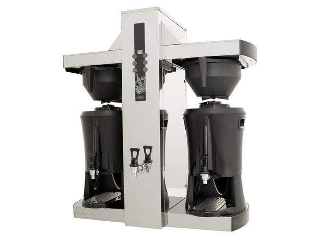 Är en snabb och smidig urnbryggare med tevattenuttag. Med sin höga kapacitet och enkla hantering fungerar kaffeserveringen smidigt även vid riktigt stora tillställningar. Bryggning sker direkt i 5-liters serveringsstationer (termosar) som har en unik temperaturhållning. Temperaturen sjunker endast ca 1 grad per timme. Serveringsstationerna är utrustade med praktisk tappkran, nivårör och integrerade bärhandtag för enkel hantering. Lyft serveringsstationen från bryggaren och placera den där du vill att kaffet ska serveras. Enkelt och smidigt. Tack vare att ingen extern värme tillförs bevaras kaffet välsmakande och aromrikt. - Tower har automatisk vattenpåfyllning - Digital display - Hel- och halvbryggsfunktion samt signal när bryggningen är klar - Två serveringsstationer ingår