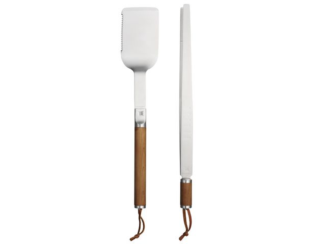 Set med två verktyg: En gedigen grillspade i rostfritt stål med tunt blad för att enkelt vända mat och en tång av hög kvalitet som ger bra grepp.