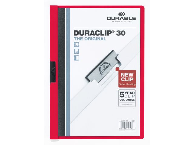 Produktbeskrivning:Durable Duraclip® är en högkvalitativ röd klämmapp i A4-format med en praktisk utdragbar klämma som är idealisk för rapporter, anteckningar eller beräkningar. Den här klämmappen rymmer upp till 30 ark och har transparent framsida och färgad baksida och rygg. Mappen är tillverkad av PVC och har en stålklämma med 5 års garanti som gör mappen enklare att hantera. Har en utdragbar stålklämma Transparent framsida Idealisk för anteckningar, rapporter och offerter Praktisk för förvaring av dokument - Kan användas tillsammans med Durable-produktkod(er): 809801