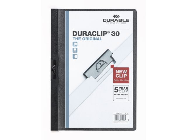 Produktbeskrivning:Durable Duraclip® är en högkvalitativ svart klämmapp i A4-format med en praktisk utdragbar klämma som är idealisk för rapporter, anteckningar eller beräkningar. Den här klämmappen rymmer upp till 30 ark och har transparent framsida och färgad baksida och rygg. Mappen är tillverkad av PVC och har en stålklämma med 5 års garanti som gör mappen enklare att hantera. Har en utdragbar stålklämma Transparent framsida Idealisk för anteckningar, rapporter och offerter Praktisk för förvaring av dokument - Kan användas tillsammans med Durable-produktkod(er): 809801