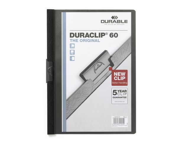 Produktbeskrivning:Durable Duraclip® är en högkvalitativ svart klämmapp i A4-format med en praktisk utdragbar klämma som är idealisk för rapporter, anteckningar eller beräkningar. Den här klämmappen rymmer upp till 60 ark och har transparent framsida och färgad baksida och rygg. Mappen är tillverkad av PVC och har en stålklämma med 5 års garanti som gör mappen enklare att hantera. Har en utdragbar stålklämma Transparent framsida Idealisk för anteckningar, rapporter och offerter Praktisk för förvaring av dokument - Kan användas tillsammans med Durable-produktkod(er): 809801