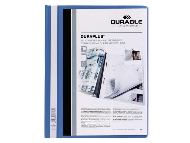 Durable Duraplus® är en offertmapp i A4-format med arkiveringsmekanism som är idealisk för rapporter, anteckningar eller beräkningar. För A4+ med transparent ficka på fram och baksidan. Färgad baksida och rygg. Med täckskena. - EU hålning - Kan användas tillsammans med Durable produktkod(er): 299602 | 153126 | 292402 - Mått: 246mmx315mm - Färg: Blå