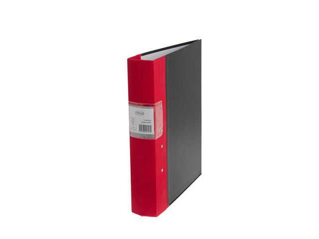 FSC-märkt svart träryggspärm med röd tygklädd rygg. MDF-skiva för en mer stabil och stadig pärm.