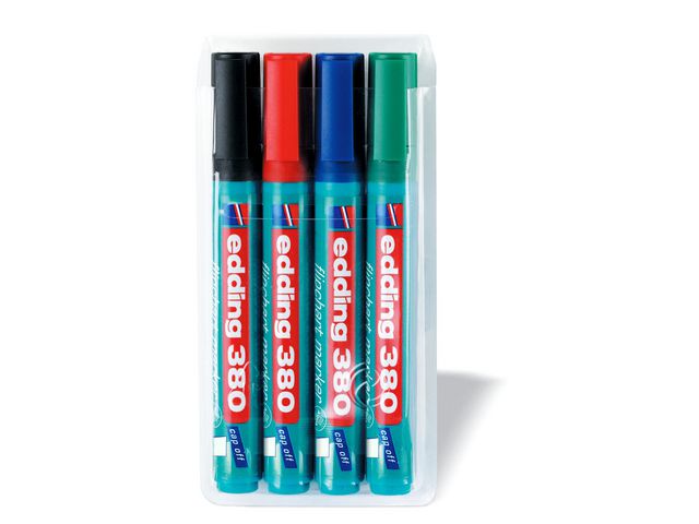 Produktbeskrivning:Märkpennan Edding 380 för blädderblock har ett torksäkert specialbläck som gör att korken kan vara av under flera veckor utan att bläcket torkar. Märkpennan är särskilt utformad för skrift och märkning på blädderblock, presentationspapper och kort. Märkpennorna innehåller ett vattenbaserat bläck som inte färgar av sig på nästa sida. - Vattenbaserat bläck - Rund spets - Linjebredd: 1,5?3 mm - Textfärg: Svart, Blå, Grön och Röd - Färg pennkropp: Samma som textfärg
