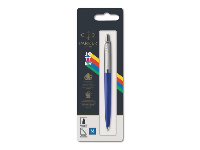 Produktbeskrivning:Den klassiska kulpennan ifrån PARKER gör nu comeback i flera trendiga färger. Kulpenna PARKER Jotter har en stilren design och en snygg rostfri stålkropp. Kulpenna PARKER Jotter med mediumspets har en klickmekanism som roterar spetsen varje gång den trycks fram för en bättre och jämnare skrift. Delar av pennkroppen samt dess clip är i rostfritt stål. Kulpennan finns i flera olika färger men samtliga har blått dokumentäkta bläck, ISO 12757-2. - Permanent bläck - Klickmekanism - Linjebredd: 1,0 mm - Textfärg: Blå - Färg pennkropp: Marinblå + silver - Dokumentäkta bläck, ISO 12757-2