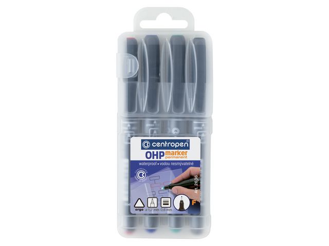 Produktbeskrivning:centropen® 2636 OHP-märkpennor är lämpliga för användning på OH-film och andra icke-porösa ytor. Dessa centropen® 2636 OHP-märkpennor har en tunn spets som möjliggör exakt skrift. Det ergonomiska greppet minskar obehaget när du skriver under en lång tid. Det alkoholbaserade, permanenta bläcket är vattenfast och slittåligt. Du kan enkelt skriva, klottra eller rita på OH-film, glas, plast och andra icke-porösa ytor med dessa märkpennor. Antal: 4 - Permanent bläck - Med huv - Rund spets - Spetsbredd 1,2 mm - Linjebredd: 0,6 mm - Textfärg: Röd, Grön, Blå och Svart - Färg pennkropp: Svart