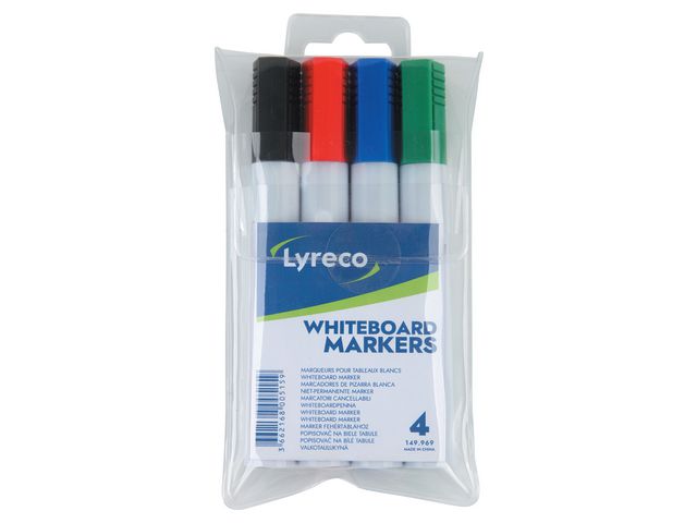 Produktbeskrivning:Penna med cap off-bläck, vilket innebär att whiteboard-pennan kan ligga en kortare tid utan huv och ändå gå att skriva med. Pennans bläck är fritt från xylen och kan enkelt torkas bort med en torr trasa. Med pennkropp och huv av PP-plast. Praktisk förpackning med alla grundfärger. - Icke permanent bläck - Med huv - Rund spets - Spetsbredd: 1,5-3mm - Textfärg: Svart, röd, blå, grön - Färg pennkropp: Vit