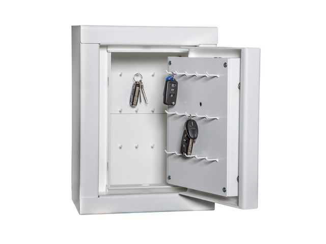 Vägghängt nyckelskåp med 42 st långa krok, inbrottsklass SS3492. - Utvändiga mått 475x350x220 mm (HxBxD) - Vikt 40 kg - Elektroniskt kodlås går att få som tillval, art 219773.