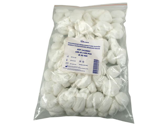 Produktbeskrivning:Rundtork gasväv - Höggradigt ren - Latexfritt - Elastisk ring: Material: Silikon - Färg: Vit - Avd fp: Återförslutningsbar plastpåse - Autoklaverbar: EO alternativt ånga 135 °C - CE-märkning: Klass 1 enl MDD - Tillverkning: Kina - Certifiering: ISO 9001:2008 & ISO 13485:2012 - Lagring: 5 år från tillverkningsdatum, på torr och sval plats utan direkt solljus eller - påverkan från värmekälla - 100% blekt bomull - 17 trådar - Varp: 104 ± 4 - Veft: 72 ± 4