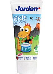 Produktbeskrivning:För mjölktänder Mild formula Mild fruktig smak Jordan Kids barntandkräm är en skonsam och mild tandkräm som är extra snäll mot munnens slemhinna. Den är speciellt framtagen för barn i åldrarna 0-5 år. Det är viktigt att skapa bra rutiner tidigt i livet, och göra tandborstning till en del av morgon- och kvällsrutinen för barn. Jordan Kids barntandkräm är fri från SLS (sodium lauryl sulfat) och innehåller istället ett milt skummedel som är skonsamt mot munnens naturliga försvar. Tandkrämen har en mild smak av jordgubb. Jordan Kids är anpassad efter Svenska tandläkarförbundets Fluor-rekommendation till barn i åldern 0-5 år. Innehåller natriumfluorid (1000 ppm F ¯) Designen på tandkrämstuben varierar.