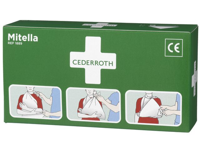 Mitellan knyts om halsen för stöd av en skadad arm. 6 st säkerhetsnålar ingår i förpackningen.
