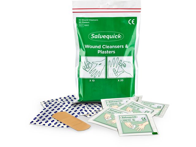 Praktisk påse med Salvequick Plåster & Savett Sårtvättare.