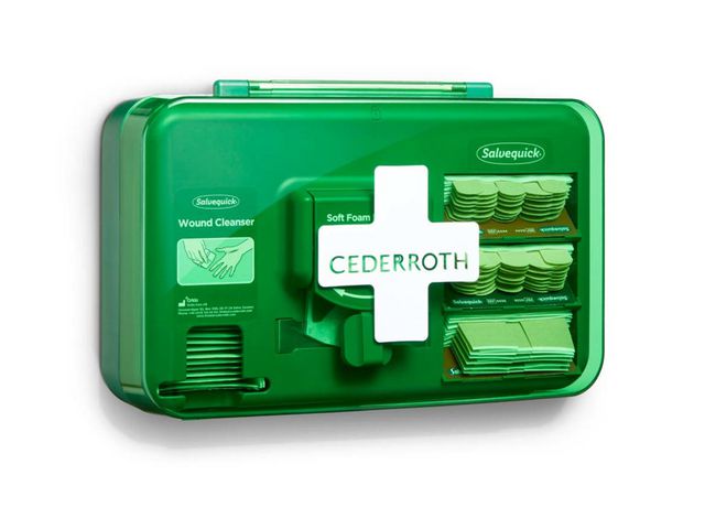 Produktbeskrivning:Cederroth Wound Care Dispenser innehåller det mesta du behöver för att ta hand om mindre sårskador i en praktisk dispenser. Innehåller Soft Foam Bandage Blue, ett självhäftande, limfritt plåster som sitter kvar även i vatten. Dispensern innehåller även Sårtvättare samt en större mängd plåster i olika storlekar. Wound Care Dispenser är ett smart komplement till Första Hjälpen-stationen och placeras där du löper stor risk att få skärsår. Innehållet hålls fräscht bakom den dammskyddande luckan och fylls på med hjälp av den medföljande refillnyckeln. - Innehåll: - Salvequick Sårtvättare 40 st (REF 3227) - Cederroth Soft Foam Bandage Blue 4,5 m (REF 51011010) - Salvequick Textilplåster 40 st (REF 6444) - Salvequick Plastplåster 45 st (REF 6036) - Salvequick XL Textilplåster 21 st (REF 6470) - 1 Refillnyckel - Mått (LxBxH): 203x306x155mm