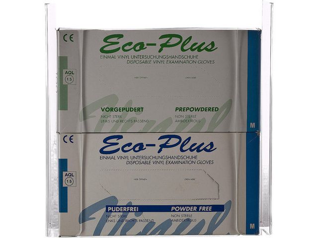Handskhållare för engångshandskar är tillverkad av heltransparent plexiglas av högsta kvalitet. Det är en stilren design gjord för väggmontering. Med ett enhandsgrepp garanterar den användaren en snabb och enkel tillgång till nya handskar. Rymmer två askar. Bredd: 27,5 cm Höjd: 28,5 cm Djup: 10,5 cm Vikt: 0,4 kg