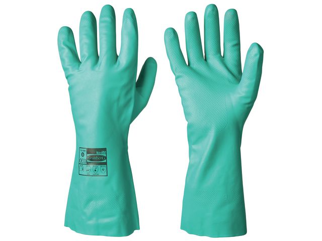 Produktbeskrivning:OBS! ARTIKEL PÅVERKAD AV CORONAUTBROTTET, OSÄKER LEVERANSTID. VÄLJ UR ÖVRIGT SORTIMENT UTIFRÅN AKTUELLT LAGERSALDO PÅ VÅR HEMSIDA. Skydda händerna mot kemikalier genom att använda dessa nitrilhandskar från Granberg. De har ett räfflat mönster på handflatan och fingrarna vilket gör dem idealiska för användning i torra eller våta förhållanden tack vare den halksäkra ytan. Bomullsfodret inuti handskarna gör dem extra bekväma. Dessutom är de längre än vanliga handskar vilket ger skydd ovanför handlederna. Nitrilgummit gör dem mycket motståndskraftiga mot kontakt med olja, fett och andra kemiska ämnen, och de är mycket praktiska i industrier såsom fordon, livsmedel, flygindustrin, kemikalier och apotek. - Kemikaliebeständiga handskar - Ger skydd mot lösningsmedel - Halkskydd och nötningsskydd - Bomullsfoder för ökad komfort - Lämpliga för användning inom fordonsteknik, livsmedel, läkemedel, kemikalier, tryckerier och flygindustrin - Extra långa för att täcka handlederna - Certifiering: EN 388, 374, 420, 1186 - Material: Nitrilgummi, bomullsflock på insidan - Färg: Grön - Längd: 33 cm - Mått: Liten - En förpackning innehåller 12 par handskar