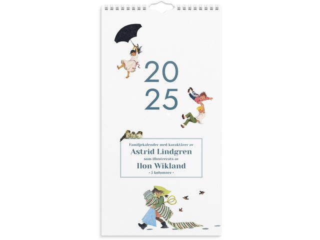 Produktbeskrivning:OBS! Almanackor och kalendrar för 2025 preliminär leverans fr.o.m. vecka 37! En väggkalender med fem kolumner för att lättare kunna planera och organisera ditt livspussel, du kan själv skapa kalenders funktion utifrån dina behov. Antingen dela in livet i aktiviteter, matlistor, födelsedagar eller dela in den utifrån familjemedlemmarna i hemmet. Vad om passar bäst i just ert hem. Kalenderns design visar illustrationer gjorda av Ilon Wikland över sagofigurer som har skapats och berättats av Astrid Lindgren. - Format: 220x430 mm. - Layout: Månad/blad. - Kalendarium: 2025-01-01 - 2025-12-31. - Spiralbunden. - Innehåll: Fem kolumner. - Antal sidor: 12. - Miljöinformation: FSC®.