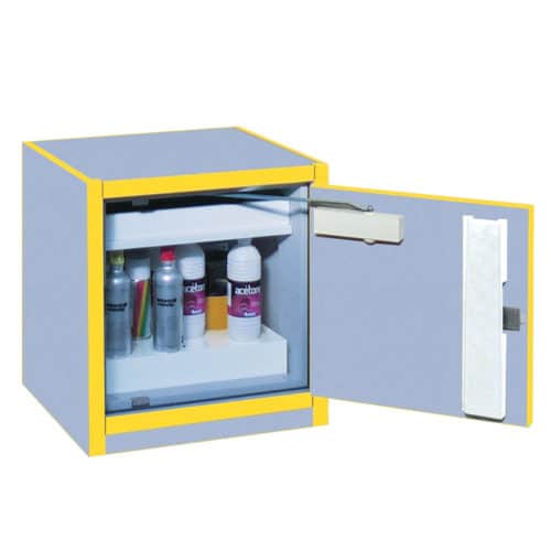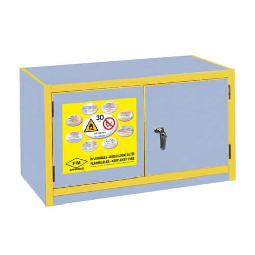 Brandisolering (ISO 1182) mellan dubbla stålplåtar i dörrar, gavlar, topp och botten. Flamsäker lackering. Lås inkl. 2 nycklar ingår. Flyttbara hyllor med uppvikta kanter och slutna hörn för att förhindra avrinning vid spill.
