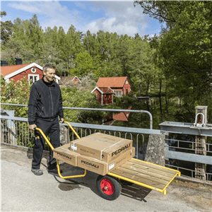 Rejäla hjul och ordentliga handtag. Bredden på vagnen är anpassad för att ta sig igenom vanliga dörröppningar.
