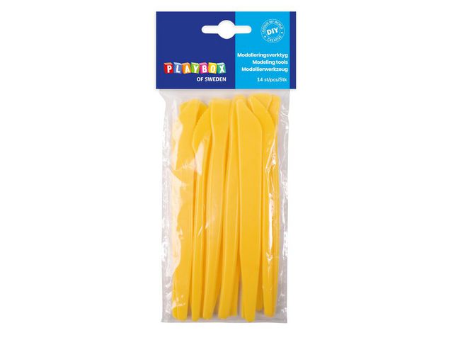 Modelleringspinnar för arbeten i lera m.m. 7 olika modeller, 2 st av varje. Längd ca 15 cm. Tillverkade av polystyrenplast.