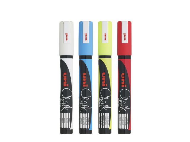 Produktbeskrivning:uni® griffelpennor finns i fyra snygga färger och är perfekta för användning på icke-porösa ytor, som till exempel metall, glas och whiteboard. Uni® griffelpennor är vattenbaserade och kan enkelt torkas bort med en fuktig trasa. Du kan markera på glasfönster, speglar, whiteboardtavlor och andra metallytor med märkpennorna. Dessa märkpennor kommer väl till pass på caféer, pubar och restauranger för att skriva menyn på whiteboardtavlan, skapa vackra konstverk på fönstren eller för att skriva ned offerter. De kan användas för att skapa välkomstskyltar och ställas utanför kaféer, eftersom skriften inte blir urblekt i regn. - Lämplig för användning på icke-porösa ytor, till exempel metall, glas och whiteboard - Vattenbaserat och kan enkelt torkas bort med en fuktig trasa - Spets: 1,8 till 2,5 mm - Färger: Blandade - Antal: 4