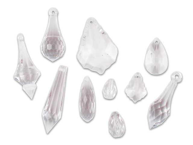 Antal: 50 st, Skimrande prismor i 10 olika former med hål för upphängning. Antal: 50st Antal former: 10 olika former Mått: Bredd: 10-29 mm, Längd: 12-47 mm, Material: Akryl PVC-fri