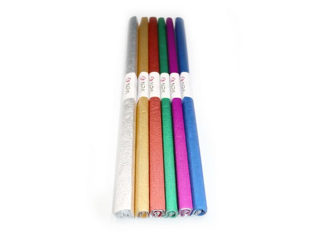 Produktbeskrivning:Kräppapper metallic är ett mångsidigt och glittrande tillägg till din samling av pappershobbymaterial. Med dess skimrande yta och fl exibla natur kan du förvandla vanligt kräppapper till fantastiska konstverk.Denna typ av kräppapper är perfekt för alla som älskar att skapa med papper. Med lite kreativitet och fantasi kan du skapa allt från vackra blommor och glittrande girlanger till eleganta bordsdekorationer och festliga smällkarameller. Endast din fantasi sätter gränserna när det gäller vad du kan skapa med detta fantas tiska material.Kräppapper metallic är lätt att forma och manipulera, vilket gör det till ett idealiskt val för både barn och vuxna som älskar att pyssla. Oavsett om du är nybörjare eller erfaren inom pappershantverk, kommer du att uppskatta den lekfulla och kreat iva potentialen som detta material erbjuder.Förpackning innehåller 1 rulle x 6 färger, Guld, Silver, Röd, Grön, Rosa, Blå. Längd 2 50 cm, bredd 50 cm.