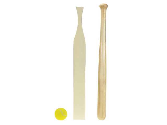 Brännbollset i hög kvalié av trä. Inkluderar runt och platt slagträ samt tennisboll. Längd runt 60 cm. Längd platt 50 cm.