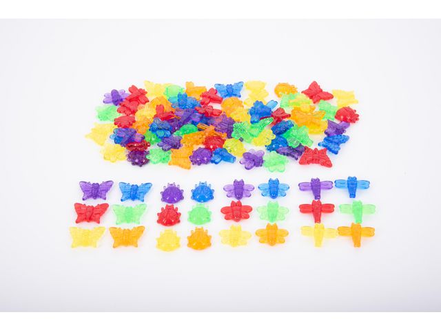 Produktbeskrivning:Färgglada detaljerade insektsformer för att räkna, sortera, skapa mönster och använda i enkla matematikaktiviteter (addera, subtrahera, dividera eller multiplicera). De genomskinliga färgerna gör dem perfekta att använda på en ljuspanel och de detaljerade funktionerna ger en taktil dimension till setet. Innehåller 4 varianter (fjäril, nyckelpiga, trollslända och bi) i 6 färger (röd, orange, gul, grön, blå och lila) i en praktisk förvaringsburk med lock. Stödjer följande lärandeområden: Matematik - räkning och sortering Fysisk utveckling - motoriska färdigheter Förståelse av världen - färg Uttryckande konst och design - fantasifull lek - Mått: ca 30-40mm - Material: Akryl
