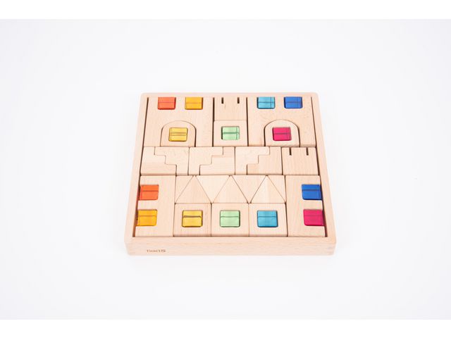 Produktbeskrivning:En uppsättning släta träbyggklossar och kristallklara färgglada juvelkuber, förpackade i en robust träbricka med riktlinjer i björkplywoodbasen för enkel undanplockning. Blocken är noggrant utformade för att vara öppna och varierade i stil, för att uppmuntra till kreativ konstruktion för äldre barn eller som en enkel staplings- och balansaktivitet för yngre barn. De vackra färgglada juvelkuberna är ett härligt tillskott till fantasifull lek (fönster, dörrar eller färgglada dekorationer), vilket är idealiskt som en påminnelse om att använda beskrivande språk. Det 40-delade setet inkluderar 25 bokträklossar, 14 färgade akryljuveler i 7 färger och en bokträbricka med björkplywoodbas. Stödjer följande inlärningsområden: Personlig utveckling - samarbetslek Fysisk utveckling - motorik, konstruktion Kommunikation & Språk - beskrivande språk Uttrycksfull konst & Design - fantasifull lek Matematik - form & rum, sortering, mönster & sekvens Förståelse av världen - färg - Storlek på bricka: 272 x 272 x 30mm - Mått: 25mm - Material: Akryl, Bokträ, Björkplywood