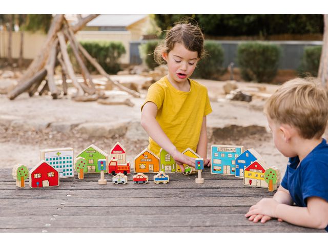Produktbeskrivning:Småstaden uppmuntrar till fantasifull lek och är en fantastisk uppsättning för massor av rollspel! Detta set med 20 delar innehåller 10 små byggnader, träd, fordon och trafikljus för att skapa din egen lilla stad. De stora men lätta träklossarna har designats för att små händer lätt ska kunna greppa dem. Komplettera gärna med artikel Människor i trä 260442.Antal: 20 delarMått: ex hus 12x11 cm, fordon 5-9cm och träd 8cm.Material: tillverkat av FSC-märkt lindträ.PVC-frittfrån ålder: 18 månader+.