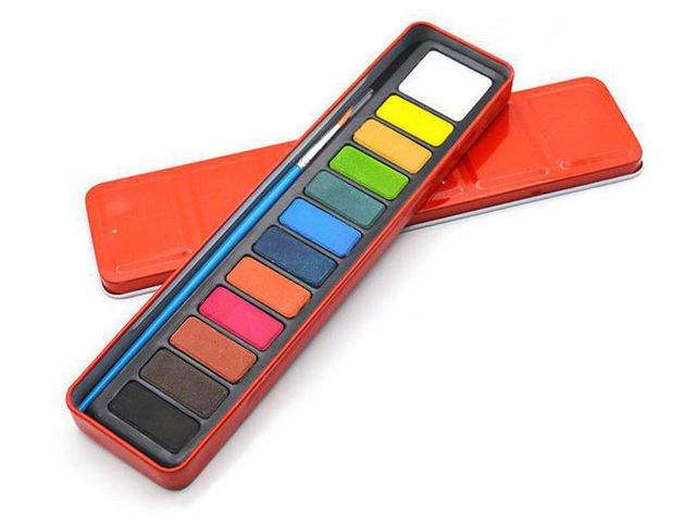 Akvarellåda i plåt som innehåller 12 rektangulära akvarellfärger i klara kulörer. Akvarellfärgerna ger ett transparent intryck och bör spädas rikligt med vatten. Akvarellfärg målas med fördel på tjockare papper, t ex akvarellpapper i block eller lösa ark.