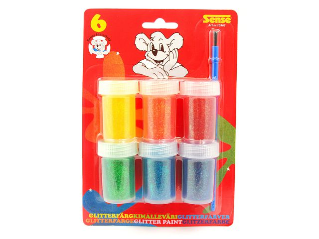 Produktbeskrivning:Dekorera och måla teckningar och hantverk med dessa Sense© glitterfärger i 6-pack som innehåller gnistrande glittrig färg. Lägg till lite glitter i dina uppgifter, minnesalbum, fotoramar och gratulationskort med dessa Sense© glitterfärger i 6-pack. Dessa glitterfärger levereras i plastbehållare och är utrustade med en pensel för enkel applicering. Denna förpackning rekommenderas för barn och vuxna. - Glittriga färger för minnesalbum och kortskapande - Med pensel - Behållare: Plastflaskor - Färg: Blandade - Antal: 6