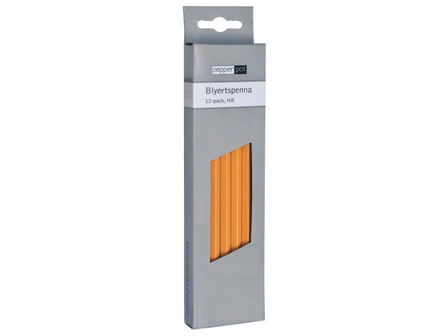 Blyertspenna HB, Gul, 12-p, FSC, Vässad. Stiftet är sammanlänkat med träet längs hela längden på pennan.