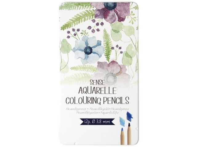 Sense Akvarellpenna 12-P i plåtask. - 3,8 mm mina - Laverbar/vattenlöslig penna - Starka och klara färger - Penna med mjuk känsla som lämnar ifrån sig rikligt med färg