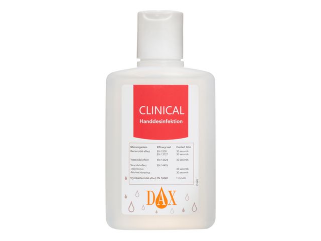 Produktbeskrivning:Denna DAX Clinical handdesinfektion är en hygienisk handdesinfektion som innehåller 75 vol% denaturerad etanol. Desinfektionen innehåller två olika återfuktare och är kliniskt testad att klara dagligt vårdarbete, tack vare återfukningen kan denna handdesinfektion användas dagligen. DAX Clinical handdesinfektion är även mycket effektiv mot bakterier, jästsvamp och olika typer av virus, så som influensavirus, HIV och Murine Norovirus. Denna smarta flaska innehåller 150 ml och är lätt att ta med. - Dax Clinical - Volym: 150 ml - 75 vol% denatuerad etanol - Återfuktande - Effektiv mot bakterier, jästsvamp och många olika virus - Liten behändig flaska