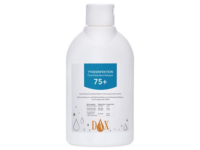 Produktbeskrivning:DAX Ytdesinfektion 75+ är avsedd för desinfektion av släta ytor t.ex. bänkar, bord och undersökningsbritsar. DAX Ytdesinfektion 75+ är effektiv mot bakterier, svampar och olika typer av virus som HIV, Hepatit B och C samt vissa nakna virus som Adenovirus och Murine Norovirus. Innehåller tensid vilket göra att ytan inte behöver förbehandlas. - pH-värde: 6-8 - Dosering: Används outspädd - Utseende: Klar/färglös vätska