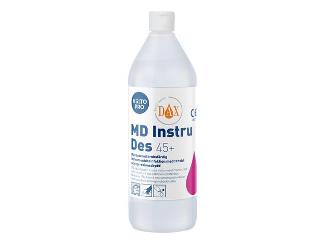 Produktbeskrivning:Medicinteknisk produkt för professionell användning inom hälso- och sjukvården samt tandvården. Bruksfärdig IPA-baserad instrumentdesinfektion (45 vol%) för non-invasiv medicinteknisk utrustning och instrumentblötläggning. För invasiva instrument enbart som för-desinfektion innan sterilisteringprocessen. Används på ytor som tål alkohol. För professionell användning. KiiltoPro MD Instru Des IPA 45+ består av 45 vol% isopropyl alcohol, tensid (tar bort smuts) samt korrosionsskydd (rostskydd). KiiltoPro InstruDes 45+ är effektiv mot bakterier, jästsvamp och höljeförsedda virus som t.ex. HIV, Hepatit B och C samt Coronavirus. CE-märkt medicinteknisk produkt, klass IIa, NB 0537. - Mikrobiologisk information: - EN13727 (baktericidal effekt) - 1 min - EN13624 (jästicidal effekt) - 2 min - EN16615 (baktericidal/jästicidal effekt) - 1 min - EN14476 (Vacciniavirus/höljeförsedda virus) - 30 sek - EN14348 (Mycobactericidal effect) - 5 min - - Instrument blötläggning: - EN14561 (bactericidal effekt instrument) - 15 min - EN14562 (jästicidal effekt instrument) - 15 min - EN14563 (tuberculocid effekt instrument) - 15 min - EN17111 (höljeförsedda virus effekt instrument) - 15 min