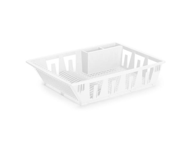 Praktiskt diskställ med utrymme för 18 st tallrikar, samt två fack för bestick. Glas och muggar kan även hängas på sidorna av diskstället. - Livsmedelsgodkänd och fri från BPA - Material: Polypropenplast - Mått (LxBxH): 49x36x11 cm - Färg: Vit