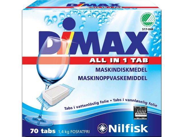 Produktbeskrivning:Dimax högkvalitativa maskindisktabletter är speciellt utformade för att avlägsna matrester, fett och kalkavlagringar från din disk och hjälper samtidigt till att hålla maskinen ren. Varje tablett innehåller en kraftfull blandning av rengöringsmedel, avkalkningsmedel och fettlösande medel som effektivt tar bort matrester och fett från dina tallrikar, glas och bestick. Dessutom skyddar Dimax maskindisk tabs din diskmaskin mot kalkavlagringar, vilket bidrar till att förlänga dess livslängd. Användning av Dimax maskindisk tabs är enkelt. Placera bara en tablett i diskmaskinens tvålbehållare och starta maskinen enligt tillverkarens anvisningar. Inom några minuter kommer tabletten att lösa upp och frigöra sin kraftfulla rengöringsformel, vilket garanterar ett perfekt rengöringsresultat varje gång. Dimax maskindisk tabs är svanenmärkta. - Låglöddrande, icke-frätande, vattenlösliga och miljömärkta tabletter - Innehåller blekmedel utan klor - Lämpligt för diskmaskiner och all slags disk - Dosering: 1 tablett per disk - pH-nivå: 10,8 - Färg: Vit - Vikt: 18 g - Antal: 70 - Svanen: Licensnummer 50170048