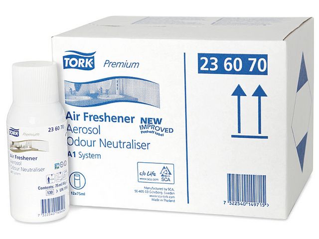 Produktbeskrivning:Luktförbättrare som tar bort dålig lukt samtidigt som den lämnar en fräsch doft efter sig. Reglera lukt i ditt toalettutrymme effektivt med Tork Airfreshener Spray Neutral Sprayerna innehåller koncentrerade doftoljor och luktneutraliserande innehåll för att avlägsna dålig lukt och samtidigt avge en varaktig fräsch doft. Sprayerna passar i Tork Dispenser Airfreshener Spray - Hög effekt och dofter i hög kvalitet för att reglera dålig lukt - Flexibel inställning för att passa flera olika toalettutrymmen - System: A1 - System Airfreshener Spray