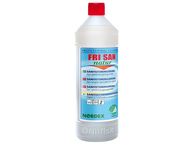 Produktbeskrivning:Med Nordex Fri San Nature får du ett professionellt universalrengöringsmedel att använda i hemmet. Ge ditt hem en professionell rengöring med ett rengöringsmedel som är starkt nog att tackla de tuffaste fläckarna. Den här luktfria sammansättningen utan färgämnen är unikt koncentrerad och kan lätt spädas ut till en styrka som passar alla sanitära uppgifter. Nordex Fri San Nature är säker att använda varje dag, oavsett om du rengör sanitetsgods, kakel eller toalettsitsar. Få dina ytor att glänsa och se fina ut igen utan att riskera skador. Applicera enligt anvisningarna. Låt det verka i ett par minuter och bearbeta med en trasa eller borst. Skölj noggrant. - pH-värde: ca 2 (koncentrat), 2,7 (brukslösning) - Oparfymerad - Dosering: Toalettstolar: koncentrat. - Normal rengöring: 10 ml till 10 liter vatten. - Lättare rengöring: 5 ml till 10 liter vatten. - Utseende: Klar, färglös vätska