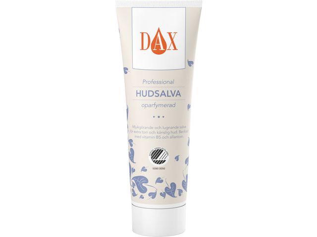 Produktbeskrivning:DAX Professional hudsalva är en mjukgörande och lugnande salva för extra torr och känslig hud. Regelbunden kontakt med vatten torkar ut huden. Om vintern är det dessutom lätt att få problem med torr hud, både av kylan och av torr inomhusluft. Många behöver också extra fukt på sommaren, när sol och bad torkar ut den känsliga huden. Hudsalvan är baserad på vegetabiliska oljor och innehåller solrosolja, allantoin och vitamin B5 som hjälper till att återuppbygga hudens naturliga barriär. Miljömärkt med Svanen. - pH-värde: på ca 5 - Oparfymerad