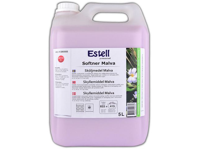 Estell Sköljmedel Malval är ett koncentrerat mjukmedel som ger tvätten en behaglig doft. Motverkar statisk elektricitet på syntetiska tyger. Lång mjukhet, lätt att stryka, bibehåller färgerna. Innehåller lättare bio nedbrytbara ämnen. pH: 3,5 - pH-värde: 3,5 - Parfymerad - Dosering: 4-5 kg tvätt, 6-12 ml - Utseende: Rosa vätska